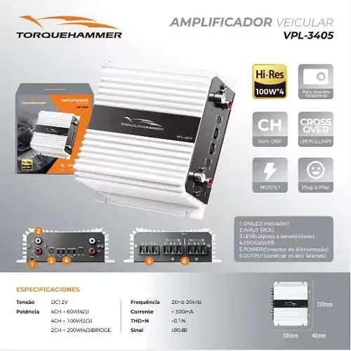 AMPLIFICADOR VEICULAR HI-RES 100W*4 TORQUEHAMMER