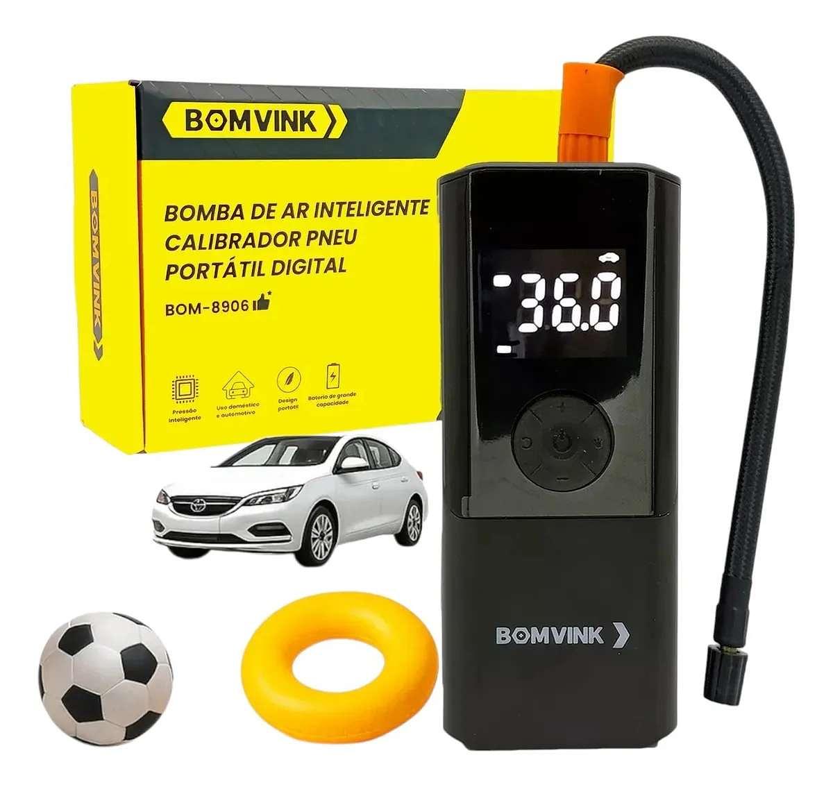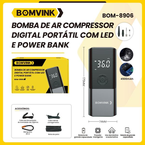 BOMBA DE AR COMPRESSOR DIGITAL PORTATIL COM LED E POWER BANK BOMVINK