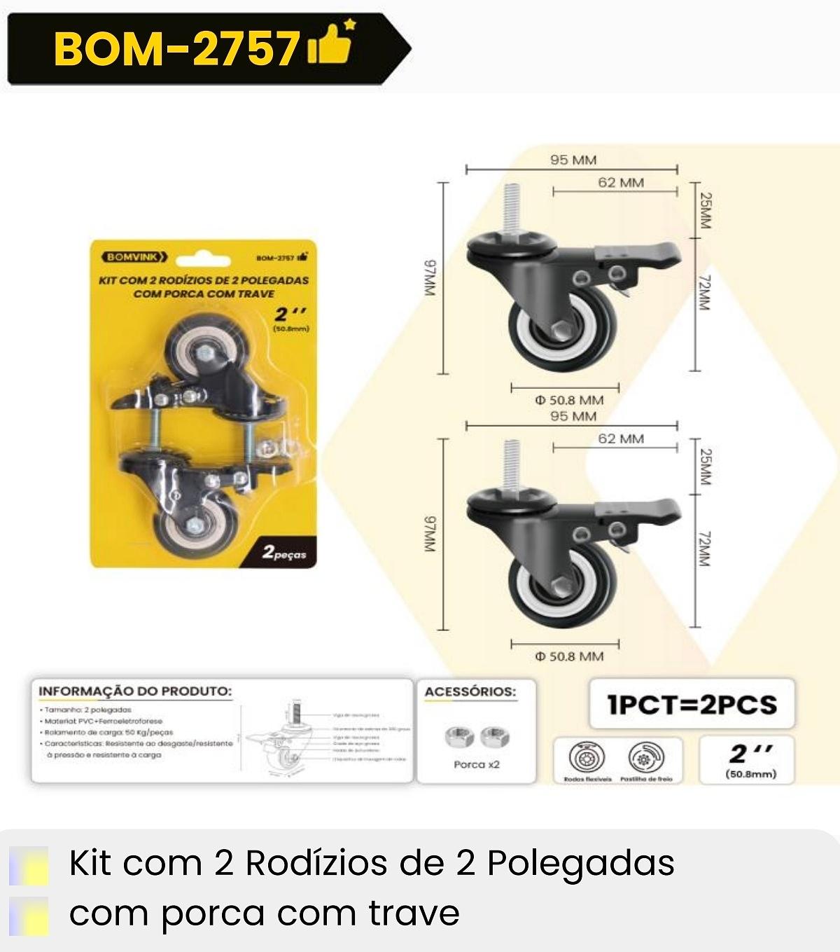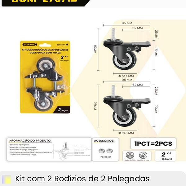 KIT COM 2RODIZIOS DE 2POLEGADAS COM PORCA COM TRAVE BOMVINK