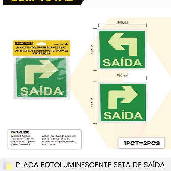 PLACA FOTOLUMINESCENTE SETA DE SAIDA DE EMERGENCIA 15*15CM KIT 2 PECAS BOMVINK